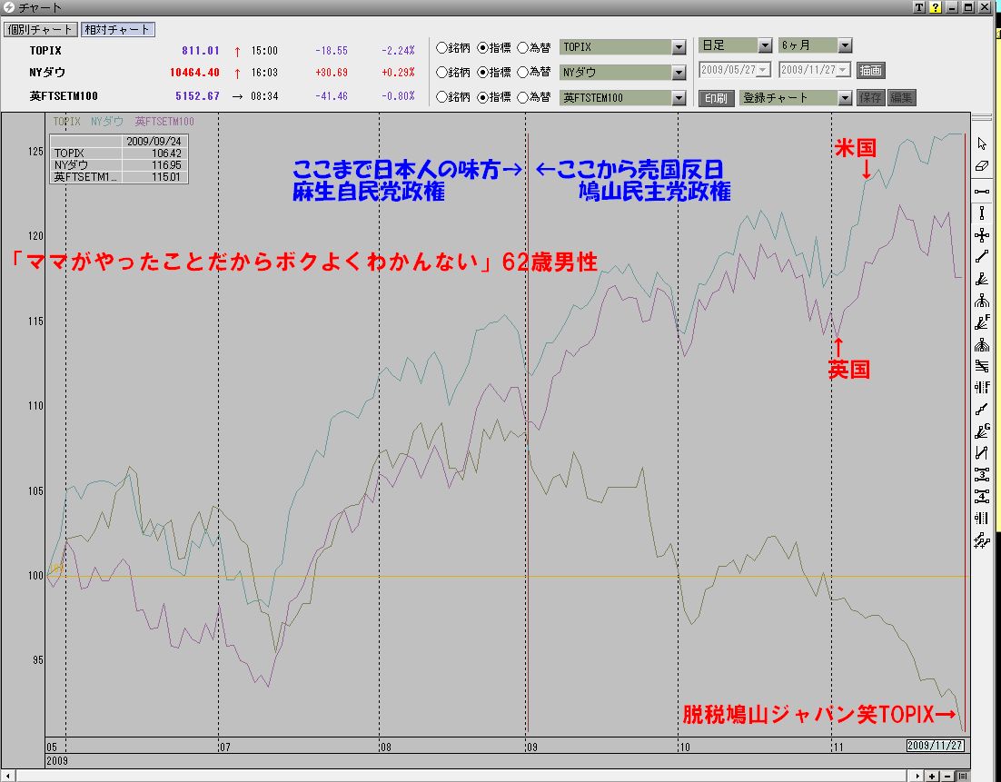 拾い物ですが多分09年5月のTOPIX、NYダウ等をそれぞれ100としたときの株価指数の変動じゃないですかね。